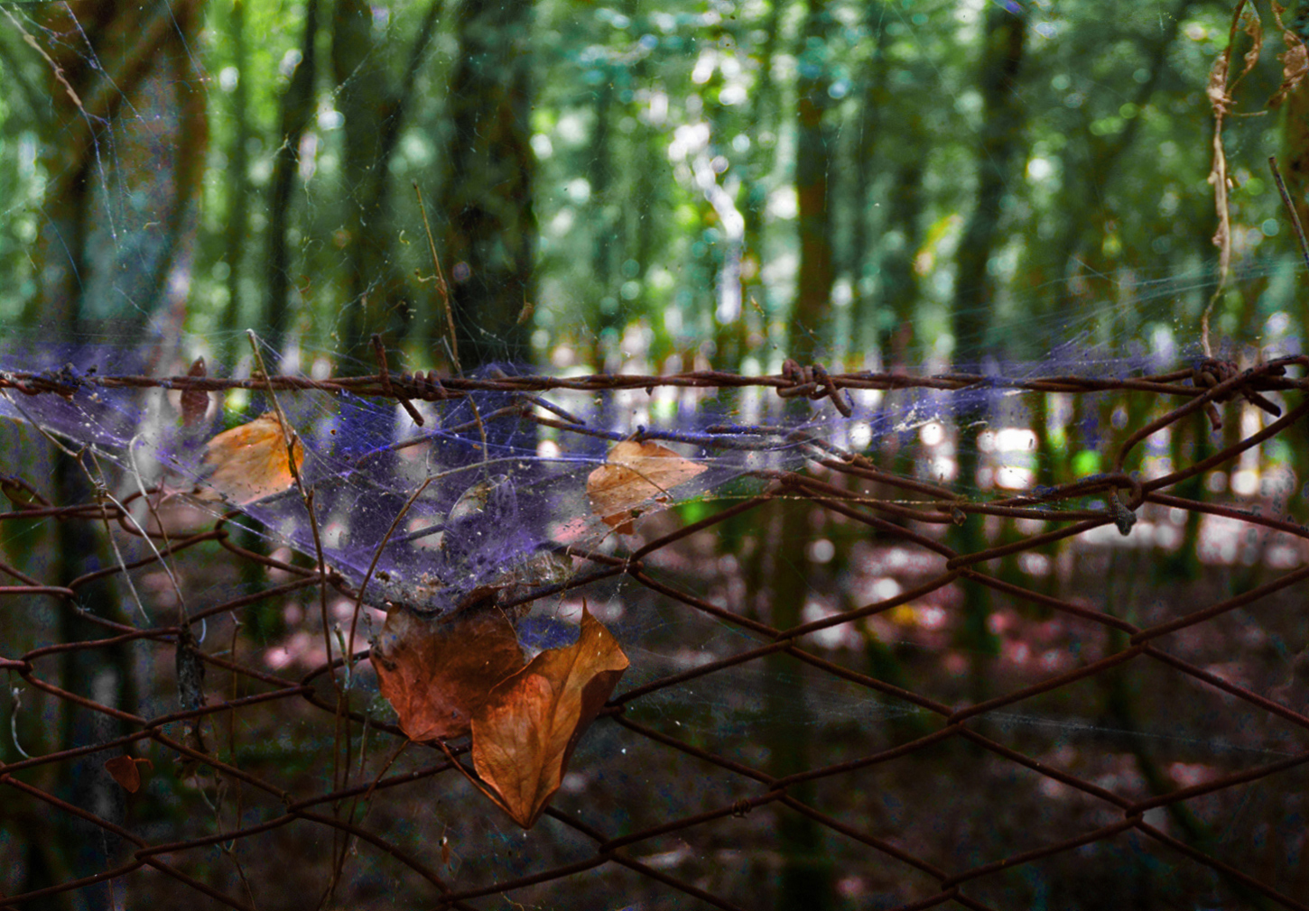 Foglie intrappolate in una ragnatela che con un pizzico di personalizzazione cromatica assume le sembianze di una sorta di bolla di energia aliena che tiene sospese le foglie.