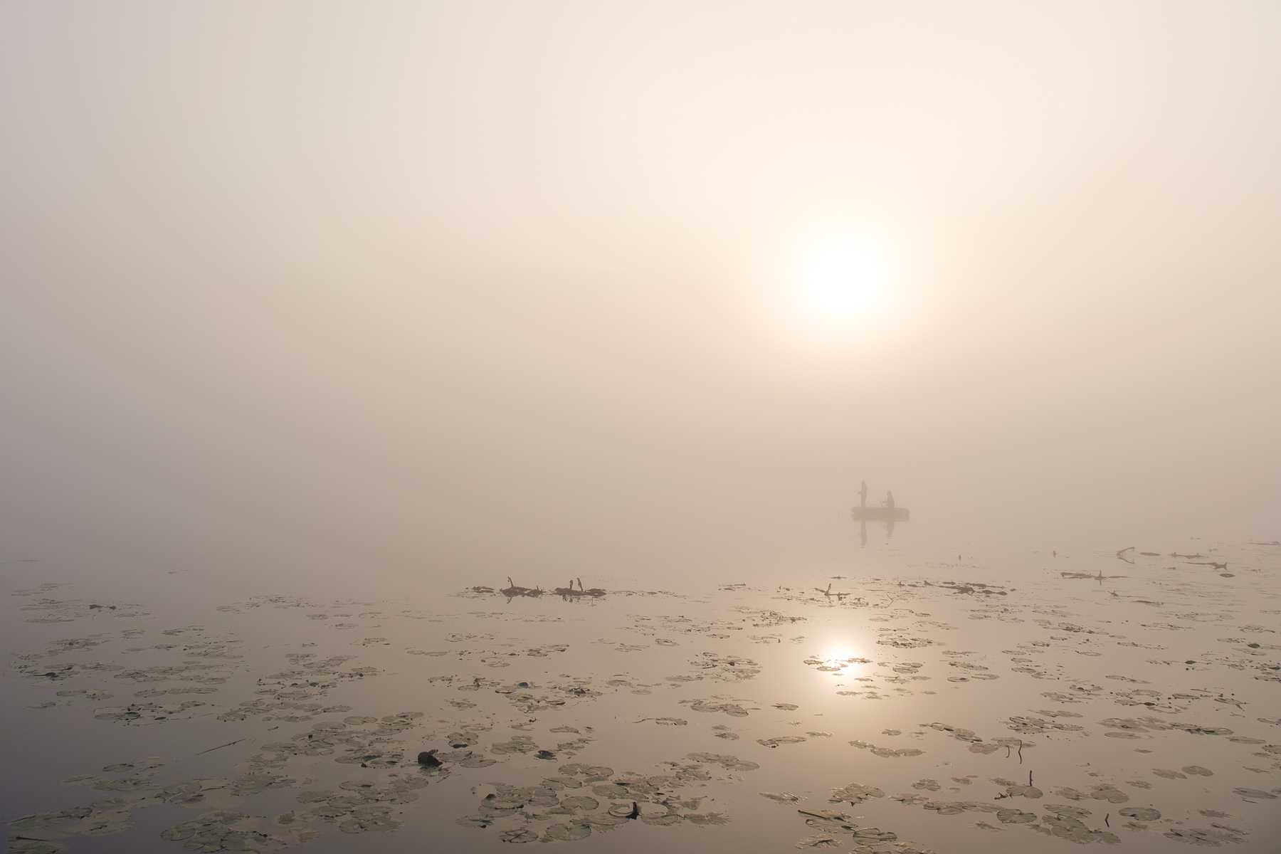 Immagine rarefatta. Se non fosse che si immaginasse che siano dei pescatori potrebbe sembrare una scena presa dalla Divina Commedia con Caronte che traghetta un anima sullo Stige.