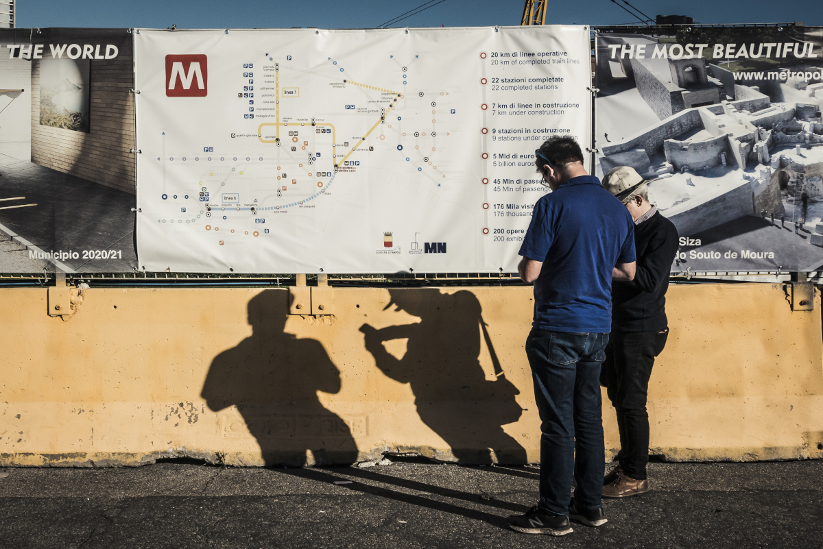 Per me una buona Street, l'ombra rivela cosa stia facendo l'uomo col cappello coperto dall'altro di spalle.
