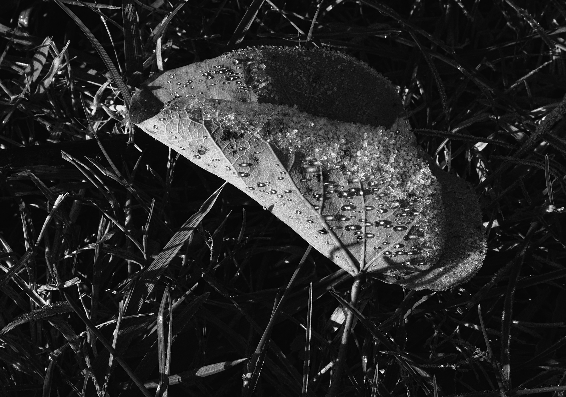Molto bella la composizione.. i granelli di brina ghiacciata è una chicca su questa foglia.. ben ripresa ed un ottimo B/N.