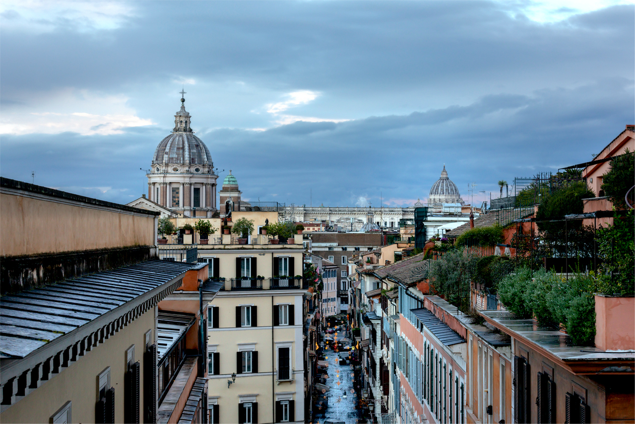 Buono il pdr e valida la composizione a valorizzare i tetti e soprattutto i bei terrazzi romani… Mi lascia però un pochino perplessa la resa complessiva, più per una certa pastosità generale che per i colori freddi… (ma non essendo io una esperta di tecnica potrei sbagliare).