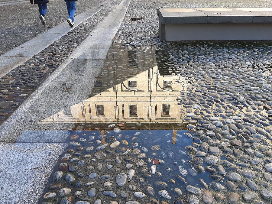 Il riflesso nella pozzanghera forma una perfetta triangolazione con la pavimentazione, ottima per me