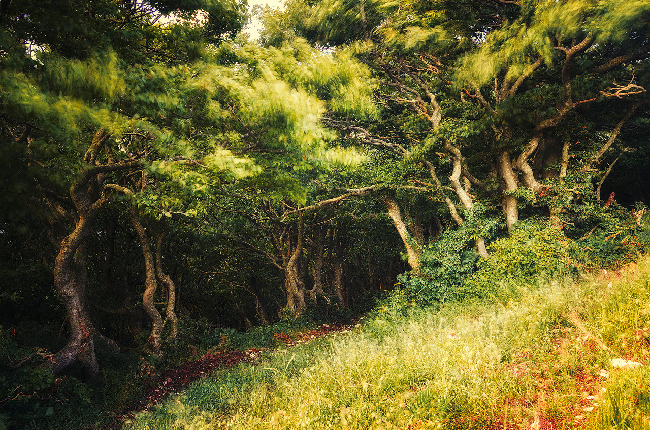 Un fotografico dipinto tra ombre scure, luci chiarissime, volumi in tinte brillanti, chiome mosse, tronchi nodosi e fluidiformi, rossi, verdi, gialli accesi.