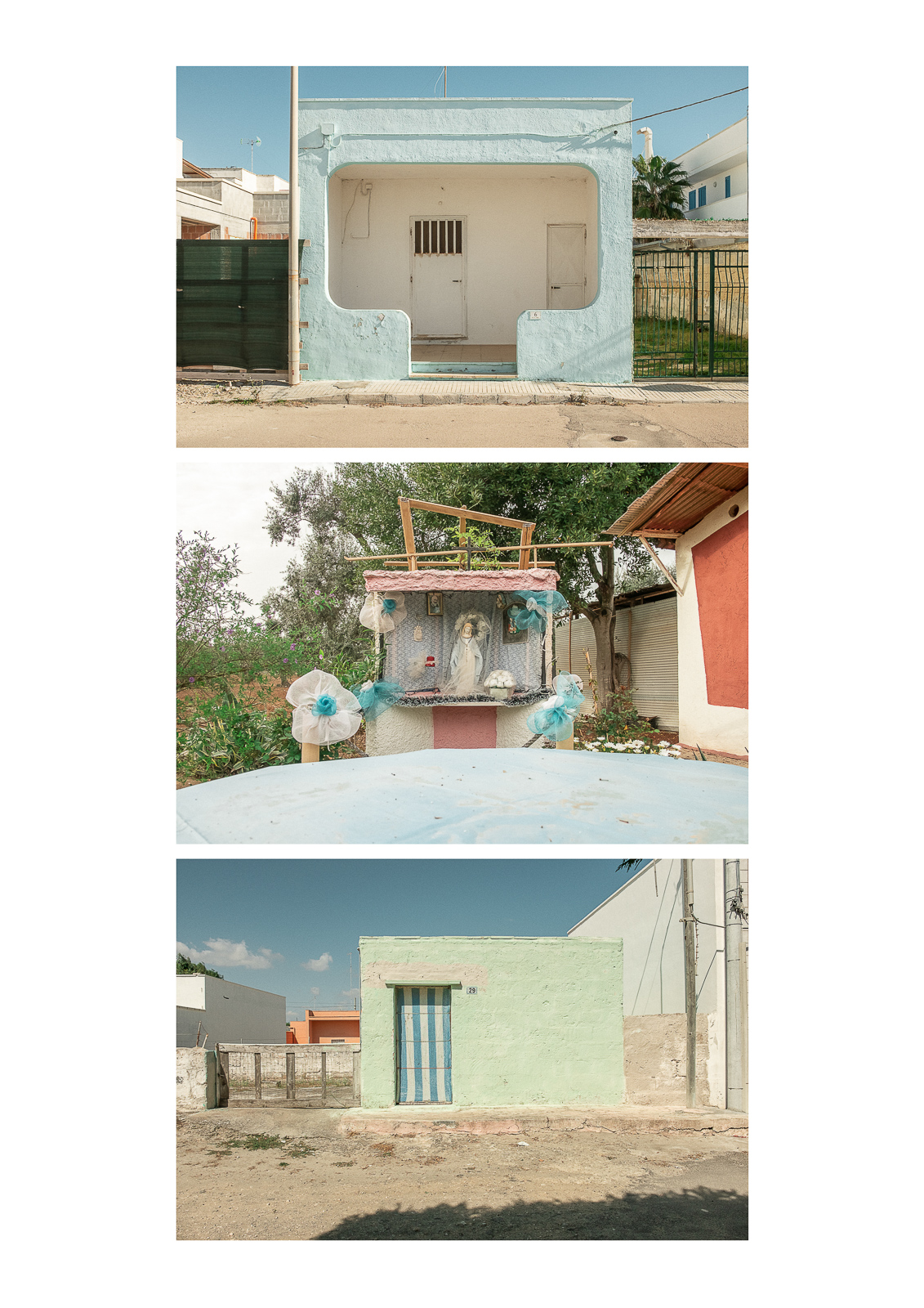 Se dovessi dire cosa accomuna queste tre tessere del tuo puzzle salentino, direi che oltre ai deliziosi colori pastello, qui a diventare protagonista è la curiosità che questi "luoghi" sanno suscitare in chi li osserva. Vien voglia di saperne di più, ecco forse questo è un particolare che va un po' a discapito del tuo lavoro, quello che stuzzica ,senza però riuscire a soddisfare del tutto la voglia di esplorare, forse per il fatto anche che le immagini presentate in trittico possono essere spulciate con meno semplicità per le loro dimensioni ridotte. Però ancora una volta hai creato un mini racconto che funziona, che ha qualcosa da dire, ben legato nella sua disomogeneità Ciao