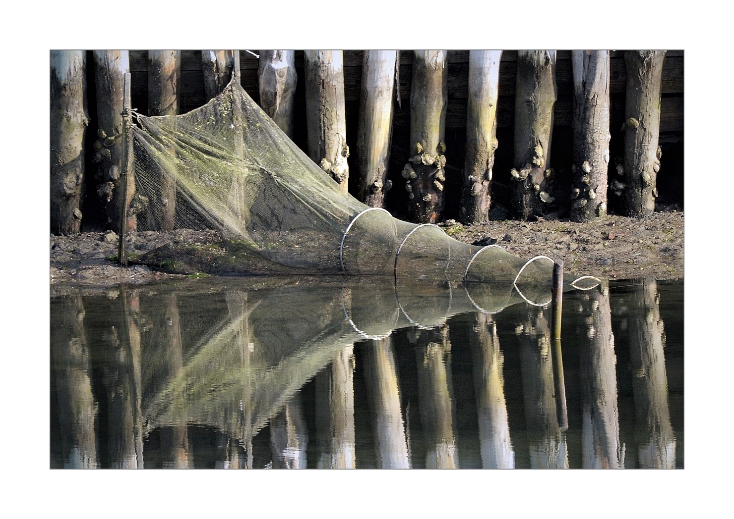 Una nassa che acquista un volume intero nel suo riflesso, su uno sfondo di elementi ripetuti.