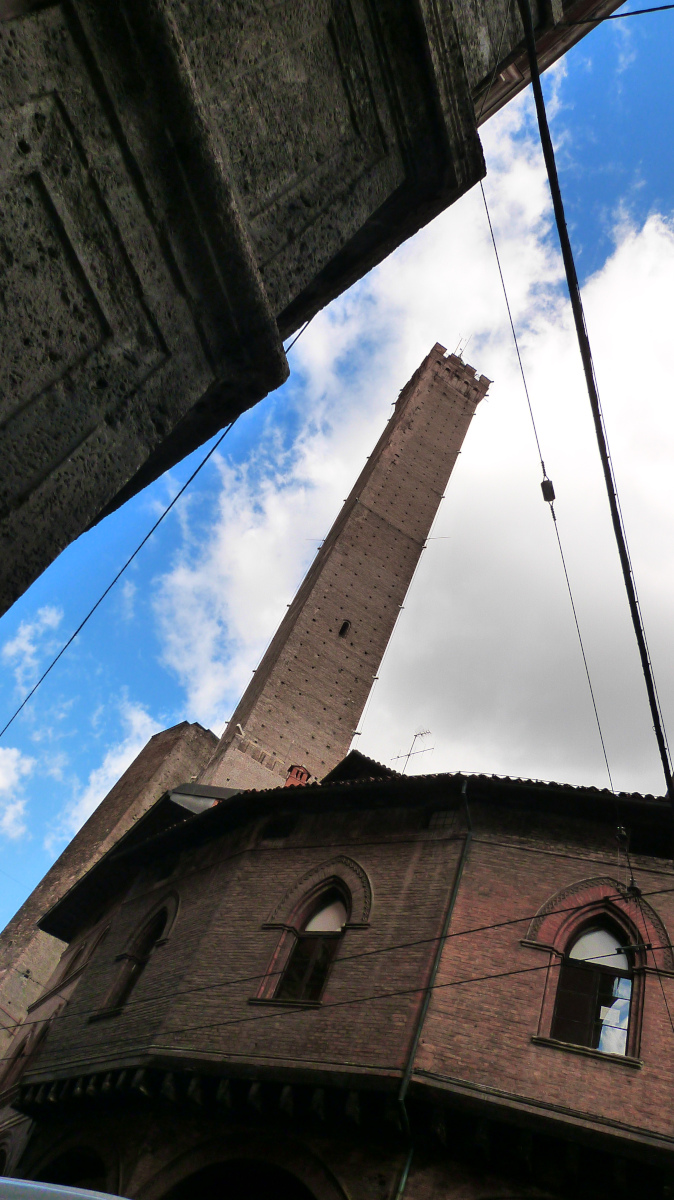 La massa grossa a sinistra della torre degli Asinelli è "solo" una porzione della seconda torre ( Garisenda ) simbolo di Bologna ( crollata a causa di un cedinento del terreno e citata addirittura da Dante nel XXXI canto dell'Inferno ) ho cercato in tutti i modi di includerla nella foto ma a causa di una colonna del portico non ho potuto spostarmi nella giusta posizione per uno scatto migliore