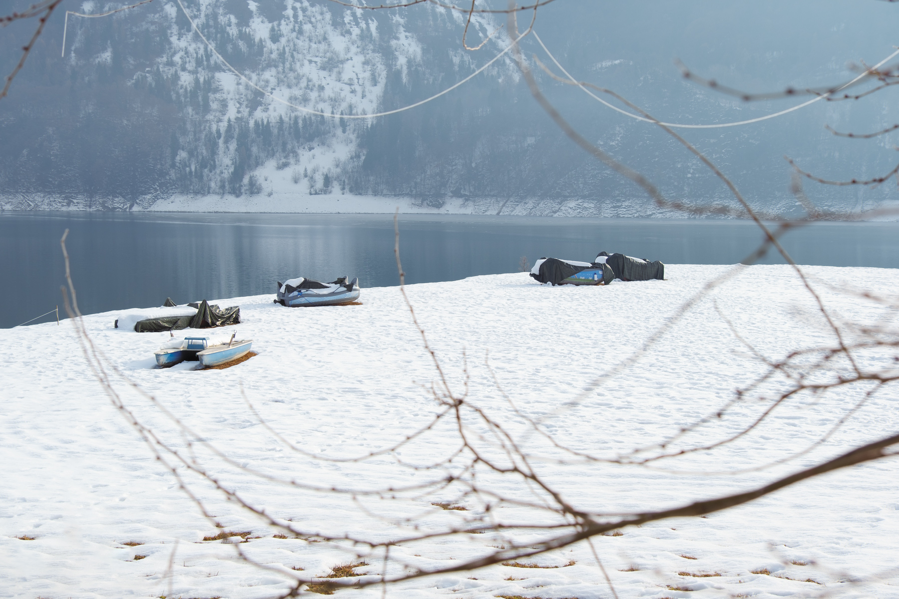 Fa una strana impressione vedere imbarcazioni estive sparse sulla riva, quasi fossero state abbandonate all’improvviso per la nevicata… Sono indecisa su rami e filo in primo piano, ma la composizione è buona e i colori gradevoli