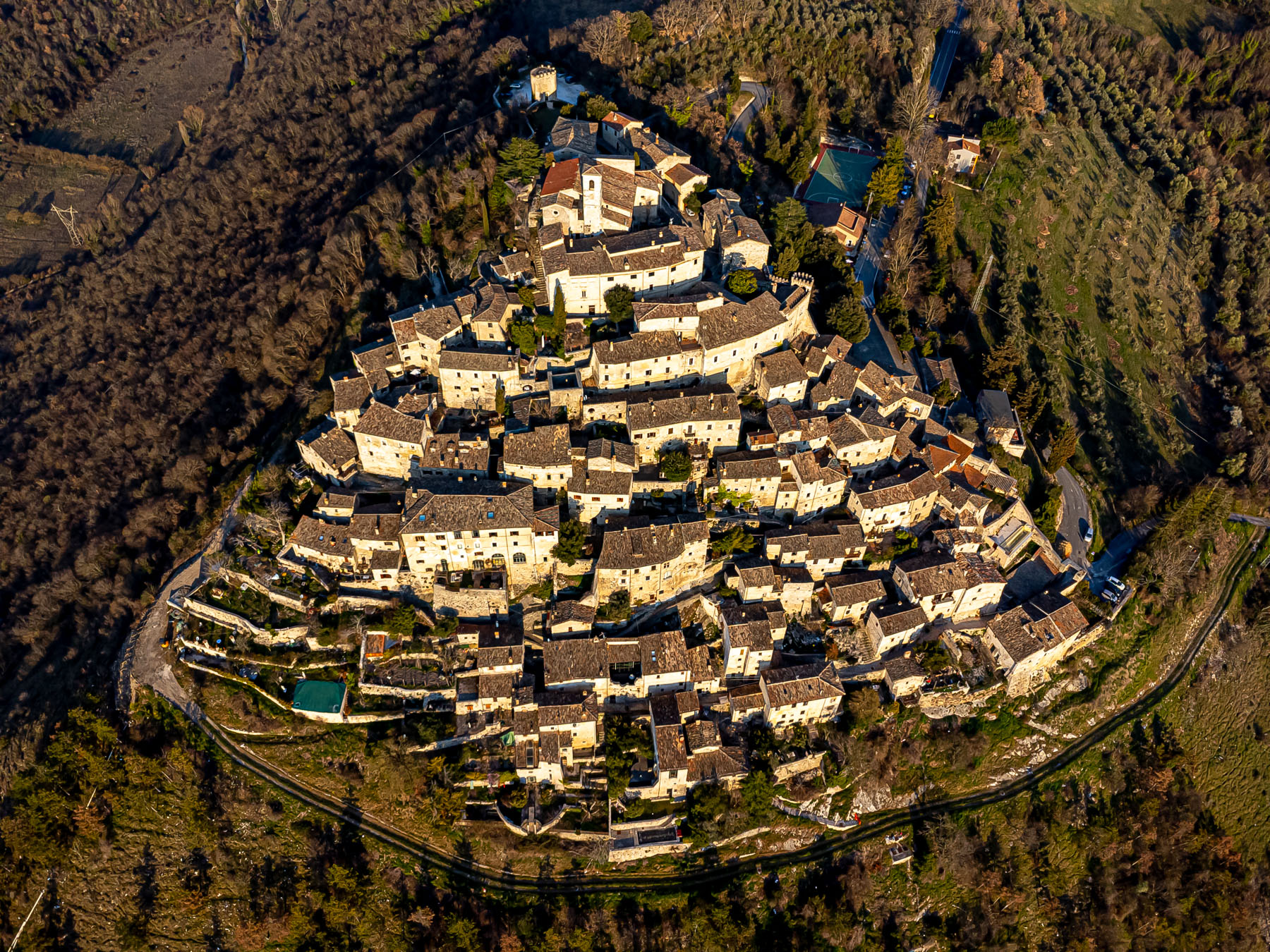 Una probabile ripresa dal drone che mette in risalto e valorizza la caratteristica forma piramidale delle casette del bel Borgo di Labro.
