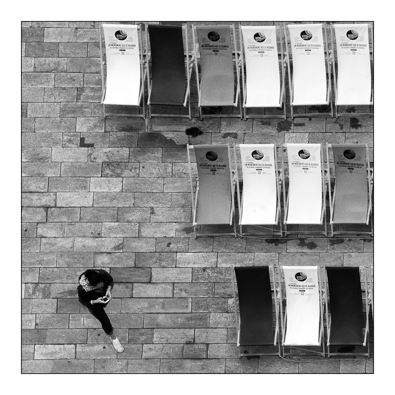 Ottima la suddivisione diagonale del frame tra le sedie a sdraio allineate e la figura in movimento Buono anche il bianco e nero, proposta gradevolissima