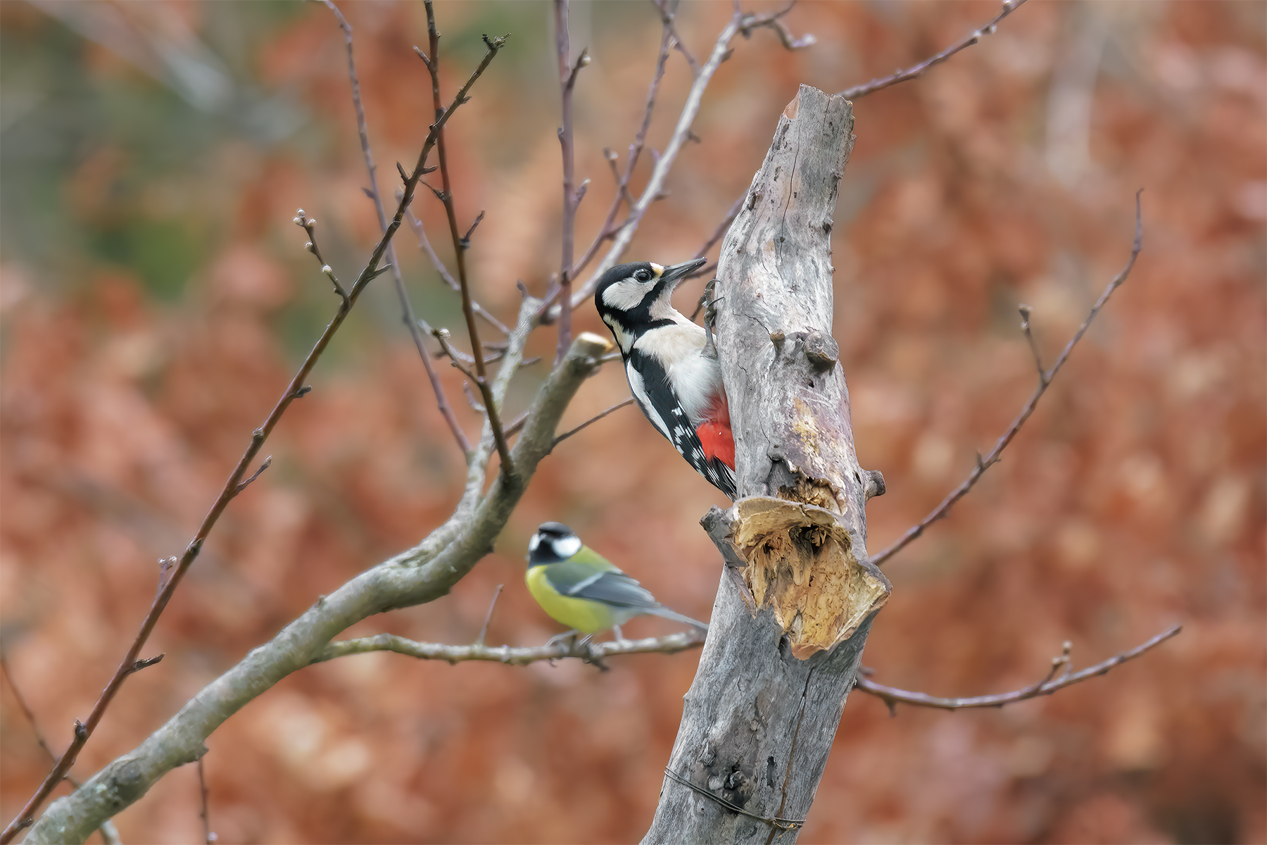 Una bella foto dove il soggetto in secondo piano sembra osservare con attenzione il comportamento del Picchio in pp.
