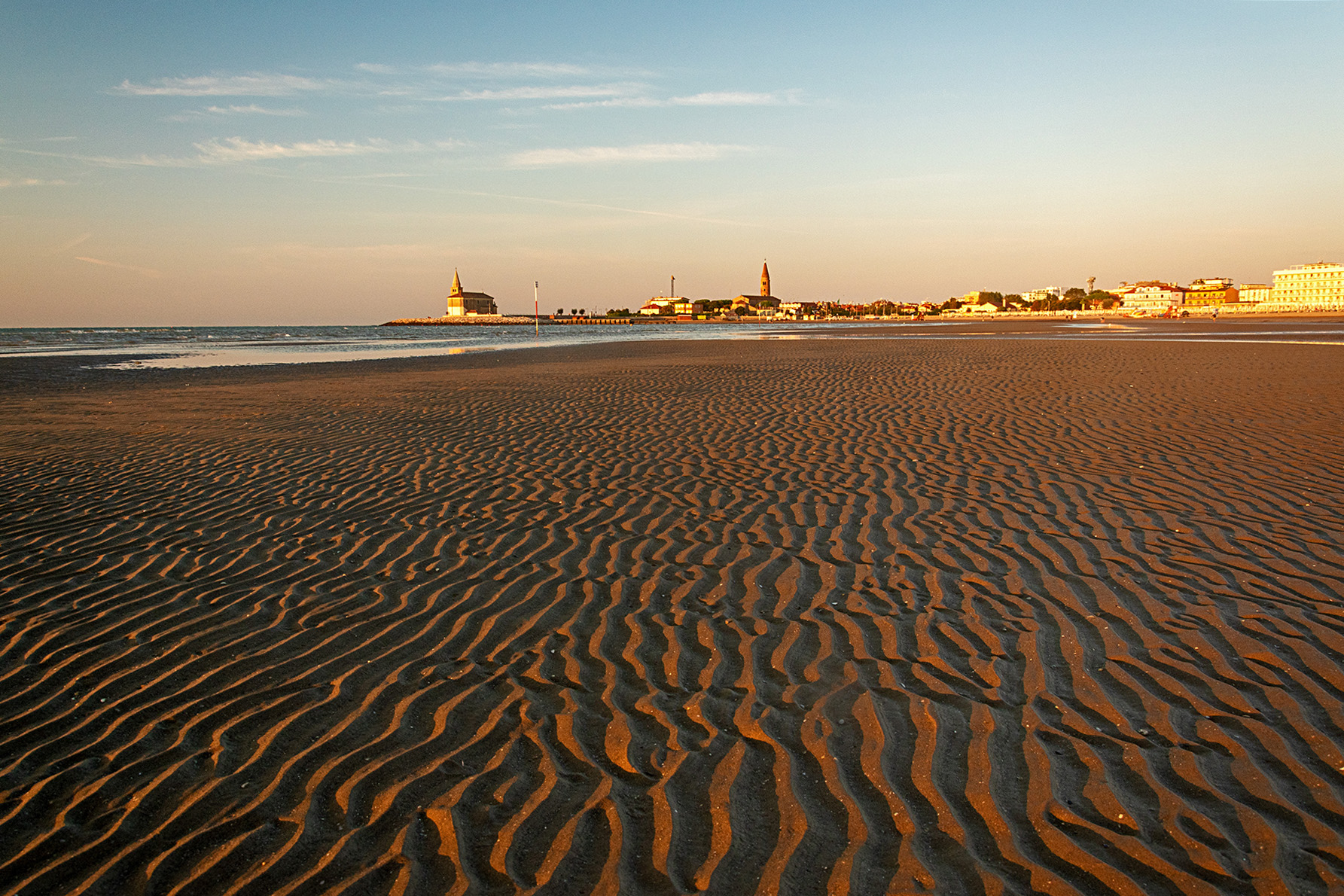 La luce dorata del tramonto(?) disegna lo spettacolo sulla sabbia. L'occhio attraversa questa splendida radura di sabbia per poi posarsi sulla luminosità del borgo sullo sfondo, rimanendone appagato. Ottima proposta