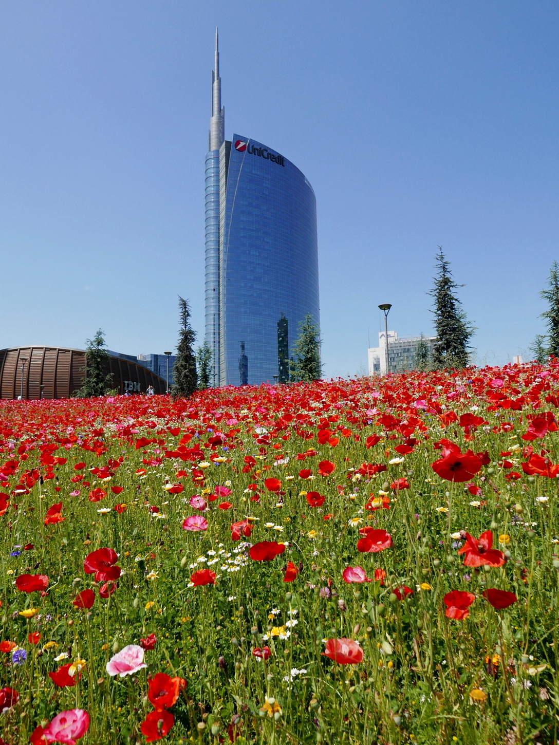 bellissimo questo prato fiorito di papaveri che ingentilisce Milano e i suoi grattacieli, mi piace
