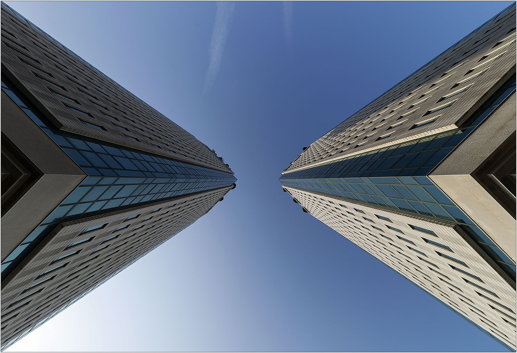 Speculari antagonisti ma anche complici della corsa prospettica verso il cielo. Uno in luce ed uno in mezza ombra.