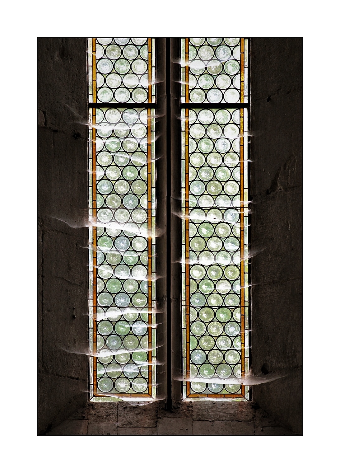 Quasi ectoplasmatiche le ragnatele aggrappate tra muro e finestra.