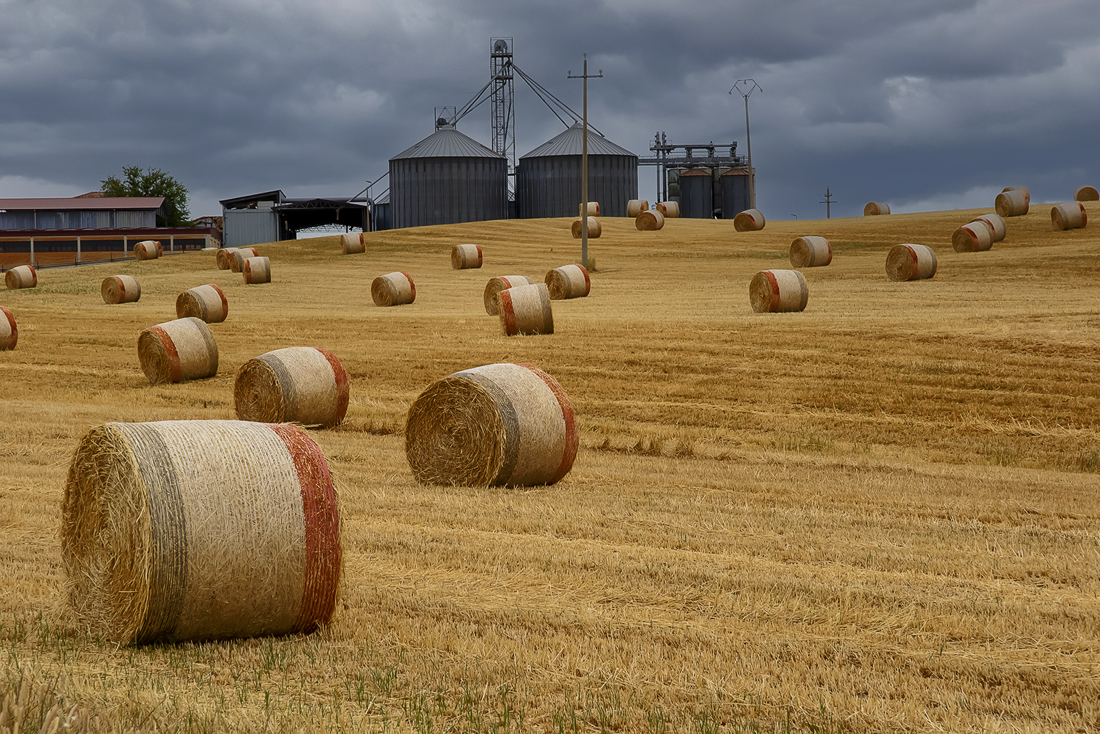 I silos sullo sfondo che lasciano immaginare contengano il raccolto di questi campi. Le rotoballe di paglia già pronte.