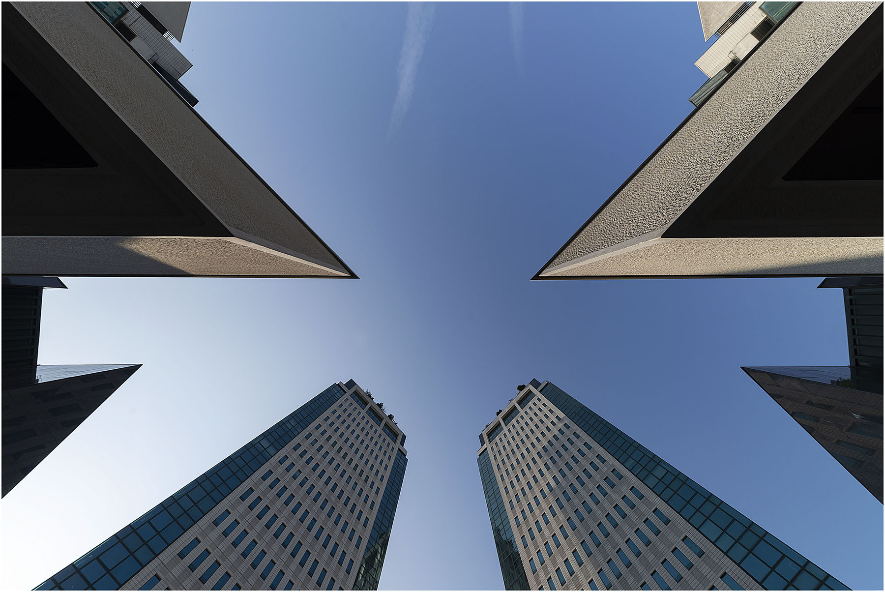 Torri Bianche a Vimercate. Il vigilante di turno m'aveva chiesto di non fotografare, dopo averlo invitato a spostarsi dato che m'entrava nell'inquadratura, non m'è rimasto altro da fare che scattare con il naso all'insù. Grazie a tutti per i graditissimi commenti ed osservazioni, doppio grazie per le preferenze.