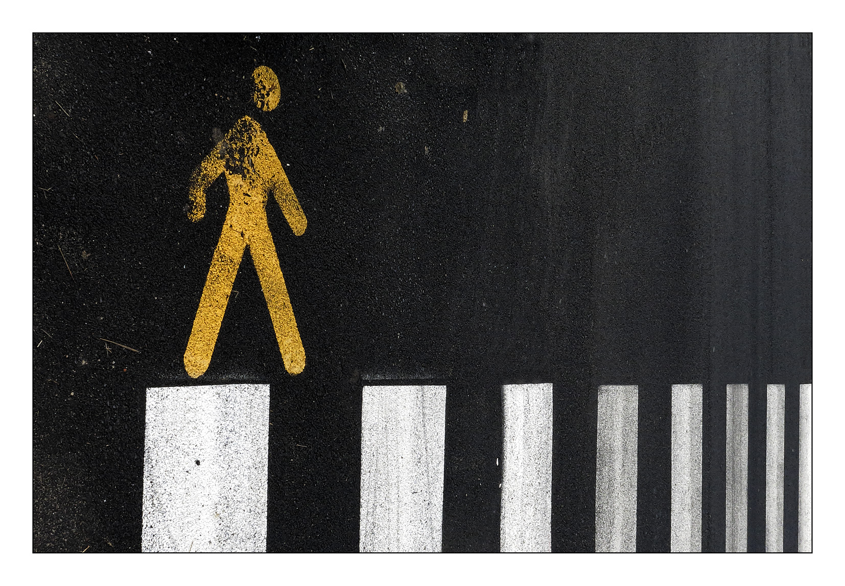La rotazione di 90 gradi si rivela, data la composizione dell'inquadratura, una scelta creativa e vincente. L'omino sembra impegnato quanto meno in una camminata con salto da un podio all'altro.