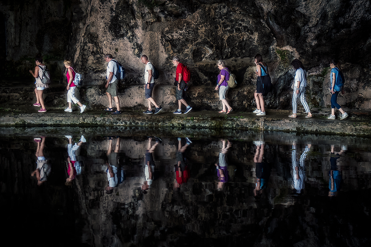 immagine molto originale e ben composta, il colore degli abiti dei "vacanzieri" illumina l'antro. Il titolo ad hoc completa l'opera