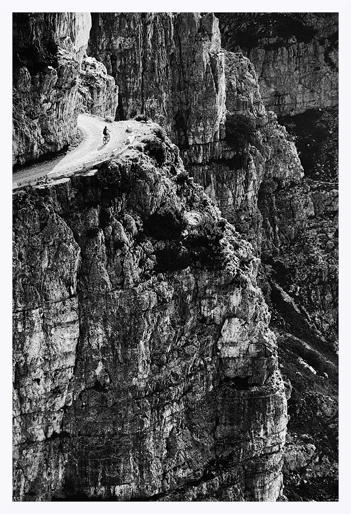 Già il percorso mette i brividi, anche se il sentiero è piuttosto spazioso… Bella composizione in cui il temerario ciclista è, ancorché piccolissimo, protagonista Buono il bianco e nero