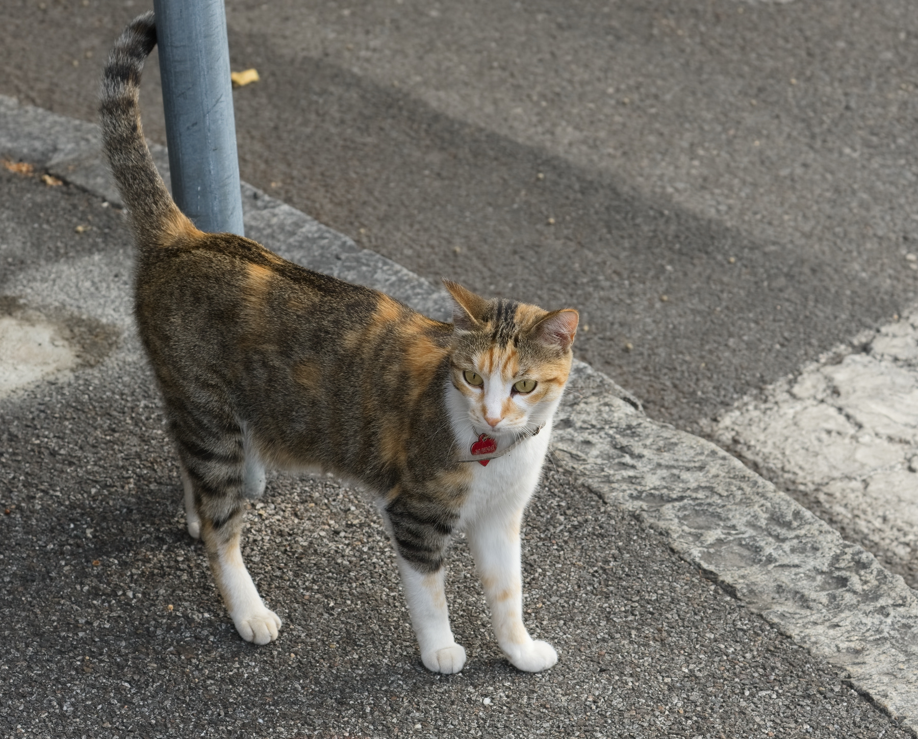 Nonostante non hai potuto abbassarti al suo livello, la posa è elegante, l'aspetto gradevole e si inserisce bene nel contesto ambientale semplice ma nonostante interessante. La curva della striscia del marciapiede che fuoriesce dall'angolo in basso a dx, il triangolo bianco, sempre a dx, che da un senso allo spazio vuoto, il palo a cui il gatto sembra voglia ancorarsi con la sua coda, sono elementi importanti per la costruzione dell'immagine. Mi piace. Così come mi piace il tuo modo di riprendere le cose semplici che tutti abbiamo a portata d'occhio. _________________ Giuseppe |