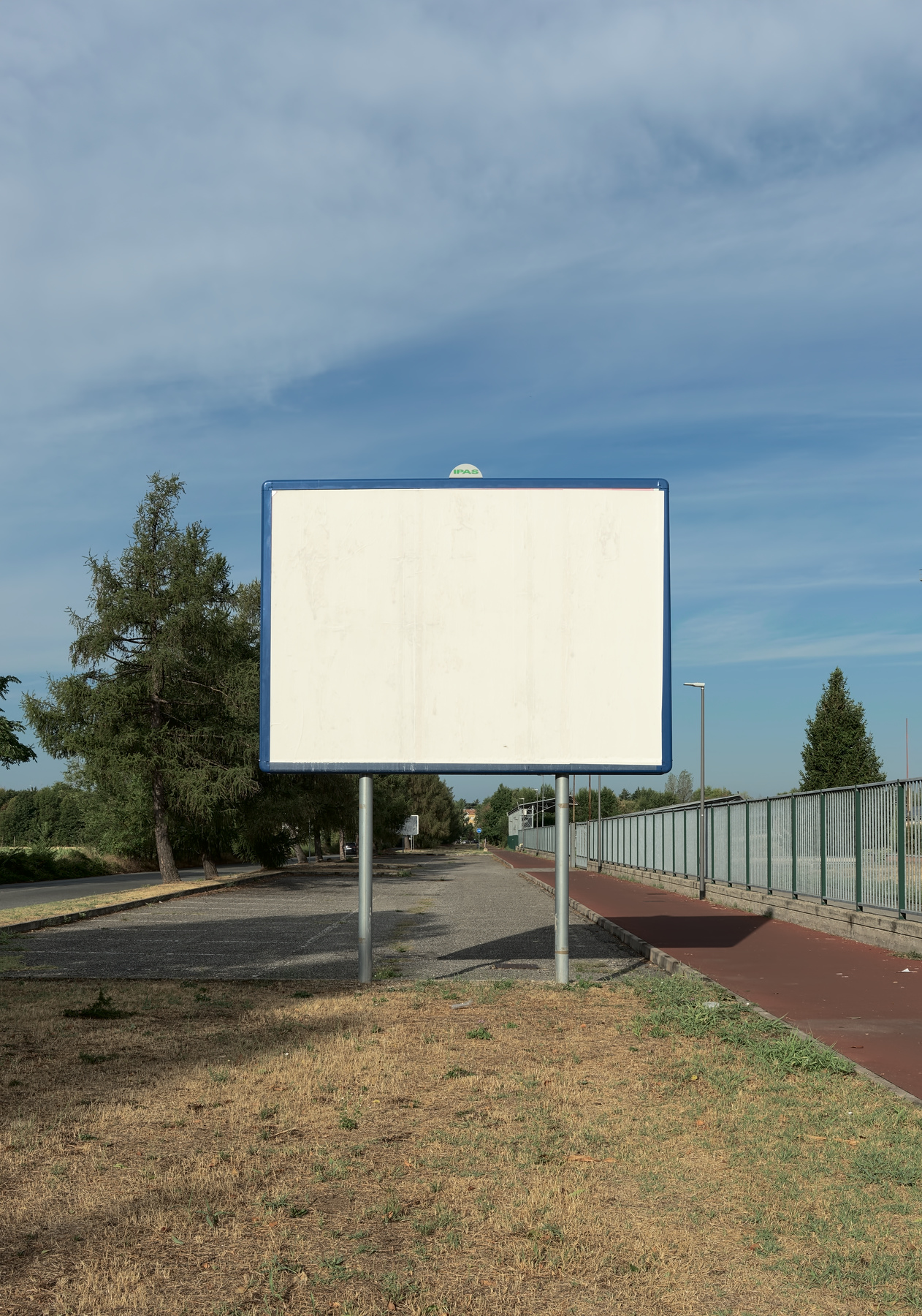 La strada è chiusa e quindi niente macchine in circolazione, ma neanche posteggiate o nella strada parallela. Anche sul marciapiede i pedoni fanno difetto, forse complice la calura estiva. Tutto è deserto finanche il cartello pubblicitario è bianco. Una situazione paradossale. Una proposta aperta a diverse soluzioni