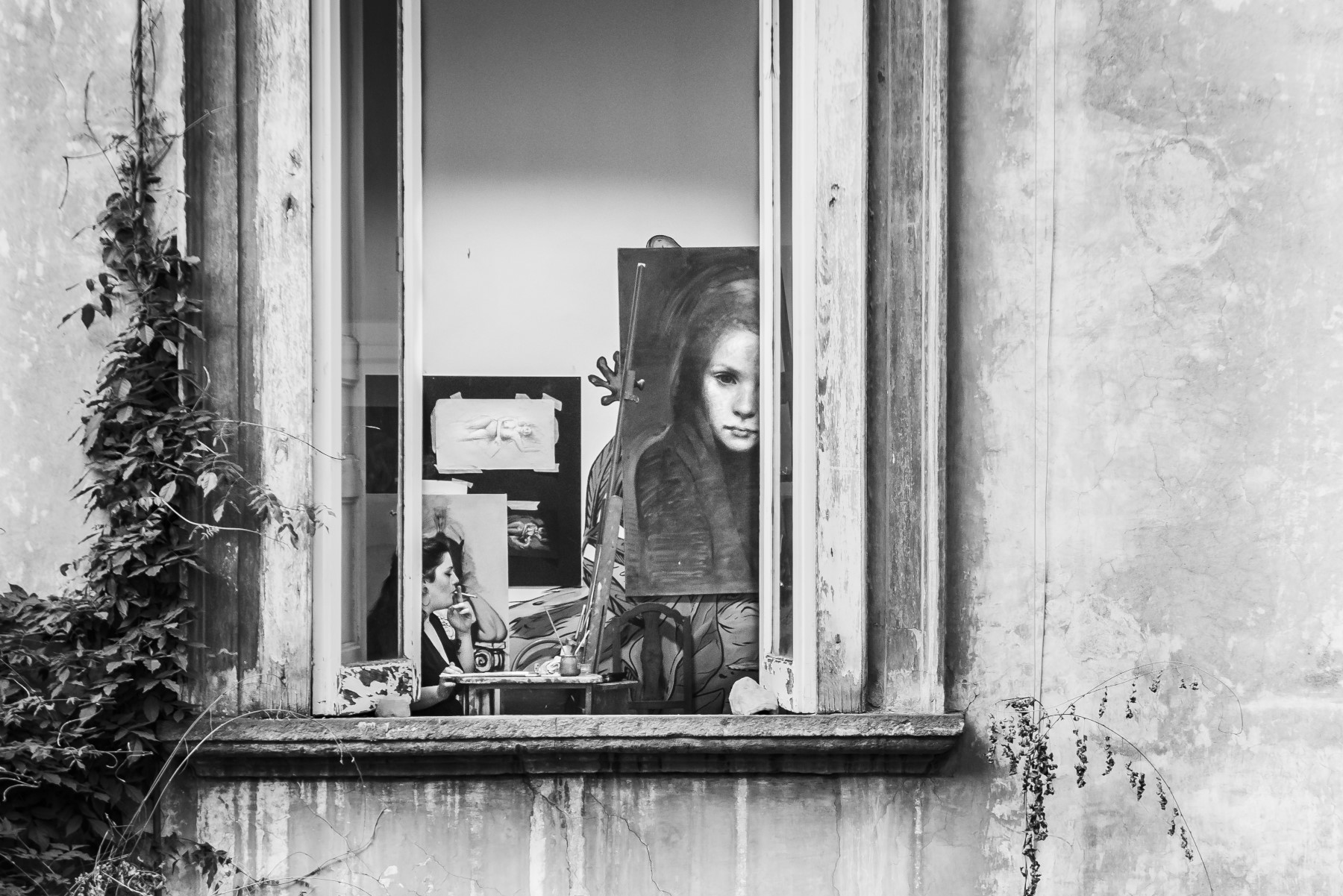 Uno scorcio interessante oltre la finestra presentato in un buon bianconero. L'ordine esterno: la cornice, le piante, contrastano con il "disordine" interno, creando una bella visione dualistica