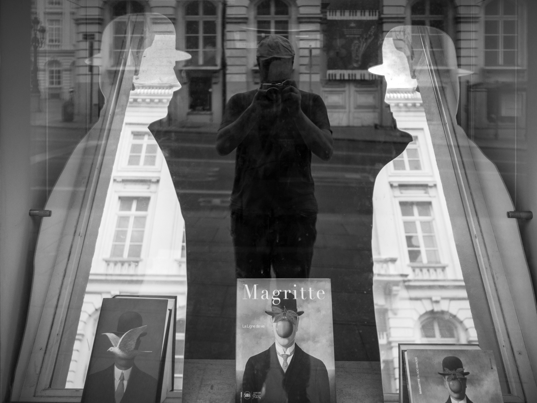 Una foto che sfrutta positivamente il senso surrealistico e psichico generato dall'allestimento della vetrina dedicata a Magritte.