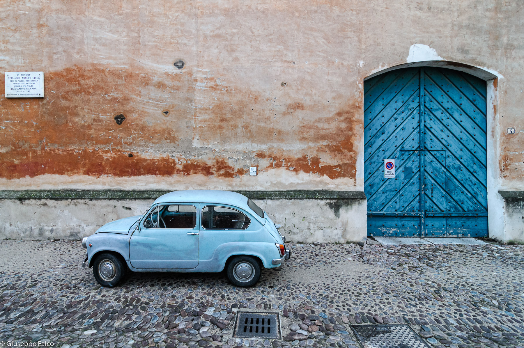 Hai ripreso una bella scena. L'assonanza di colore tra auto e portone è immediata e bene si sposa con le cromie della parete . Come già suggerito, per dare più forza a questo 'ritratto ambientato " trovo appropriati gli interventi di clonazione consigliati. Mi piace. Un saluto, guido