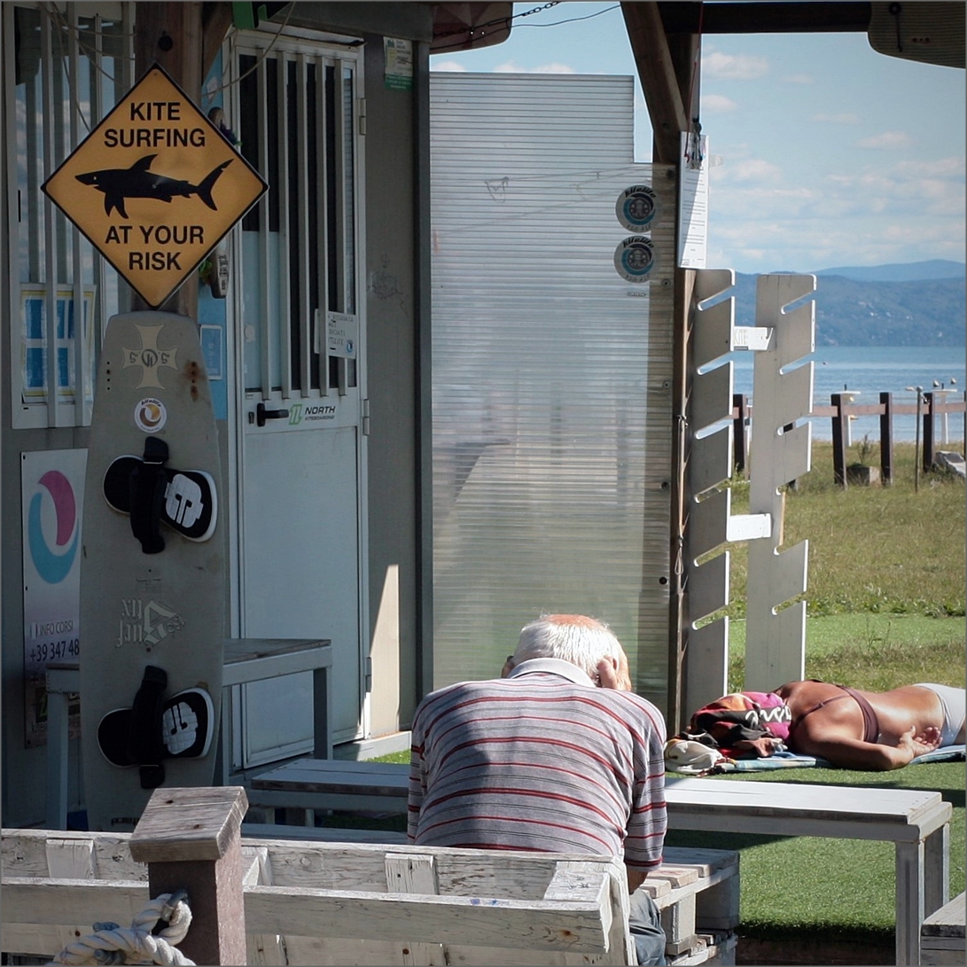 Una foto che sembra rappresentare un momento sospeso fra noia e attesa, di quando certi quarti d'ora sembrano durare un'eternità in attesa di qualche clienti che arrivi a noleggiare l'attrezzatura da surf.