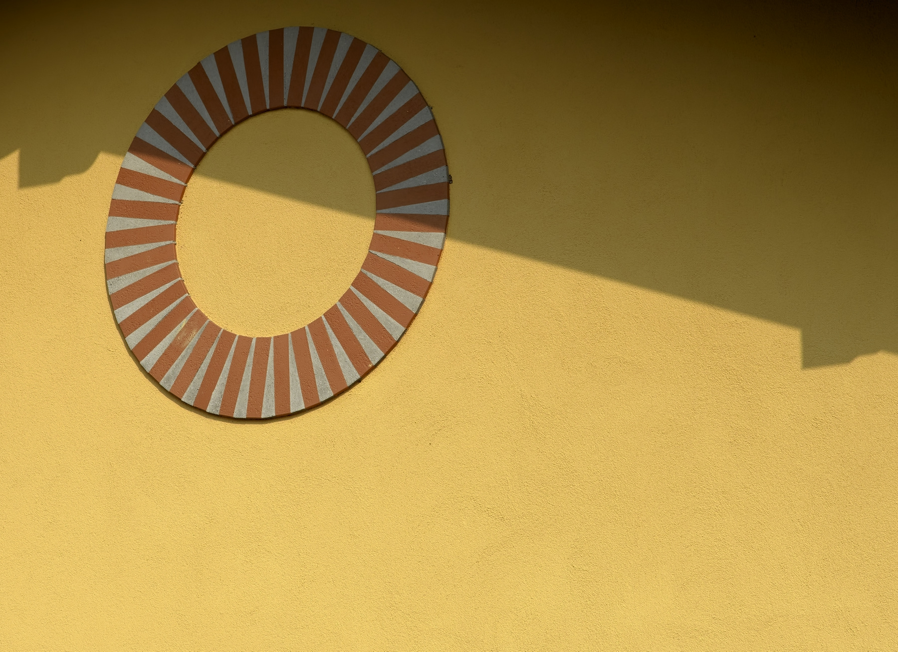 Particolare isolato con attenzione, esaltato nella sua presenza dal colore del muro e dall'ombra che attraversa il cerchio.