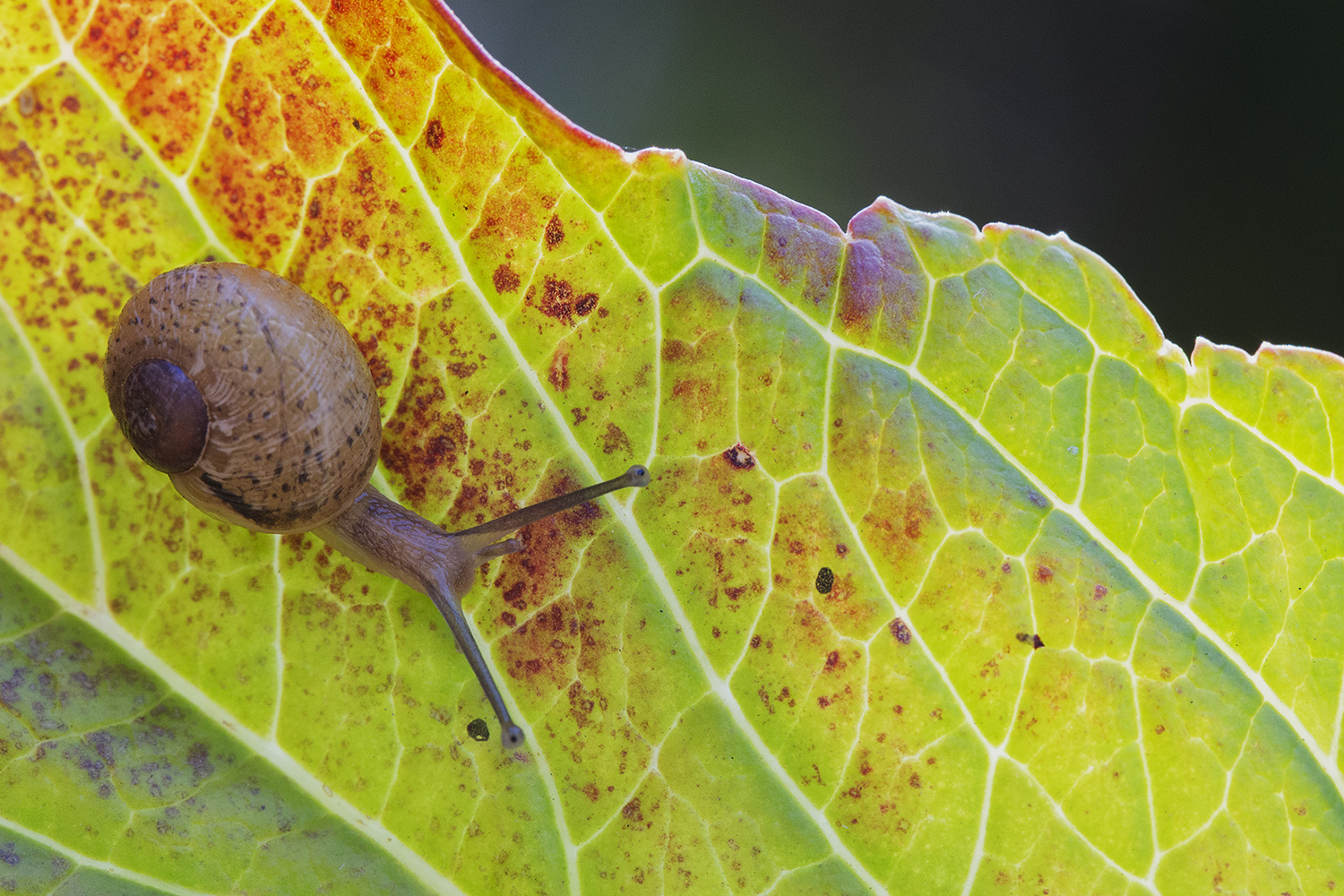 Belli i colori accesi della foglia e simpatica la lumachina , bello scatto