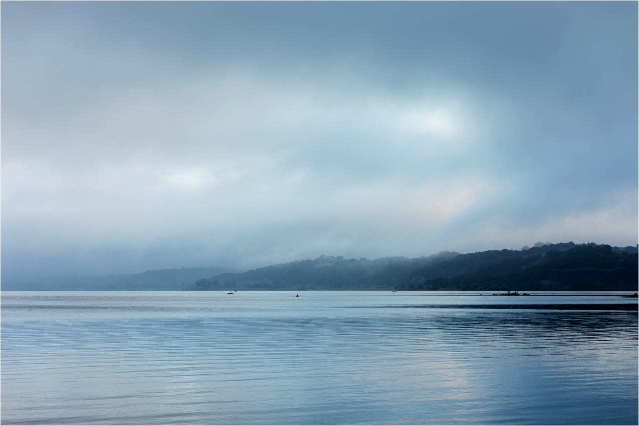 Le forme collinari digradano nel lago sfumando nella foschia con una ripetitività che fa quasi pensare ad una clonazione, ma naturalmente non è così.