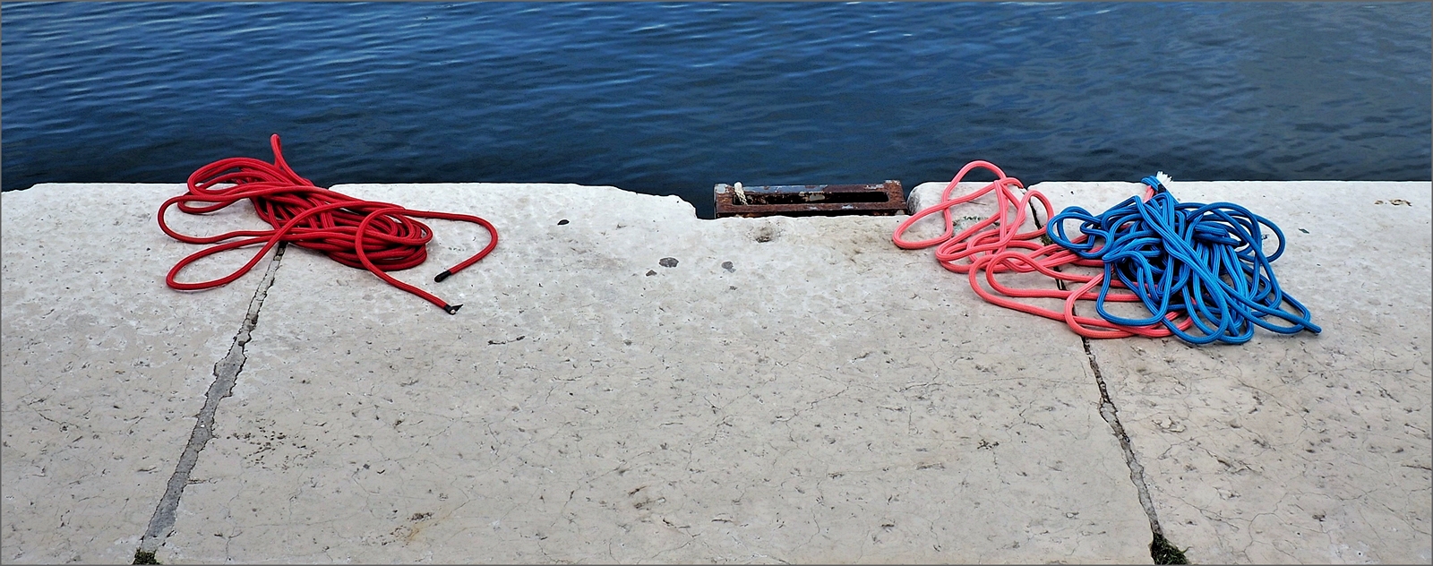 Tre belle macchie di colore innestate su una composizione già di per sé interessante per la contrapposizione tra il tratto di molo e la fettina di mare.