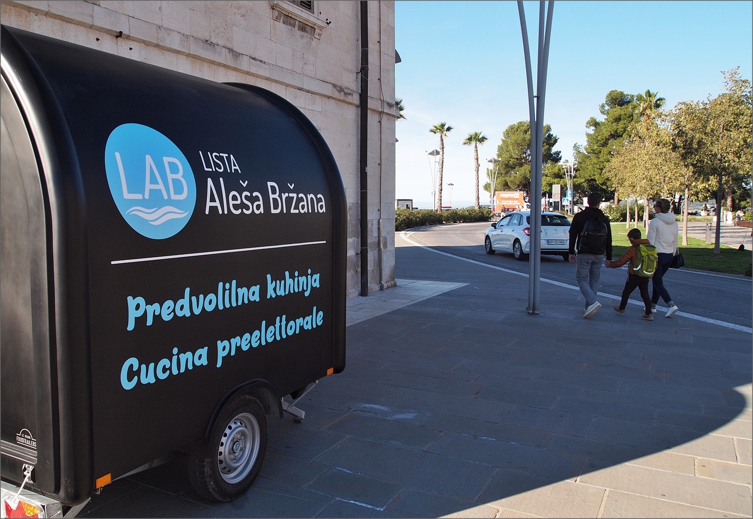 Una campagna elettorale singolare, in una città pulita e ordinata, che solo una famiglia a passeggio e un’auto in transito rendono viva… Un’immagine interessante Smile