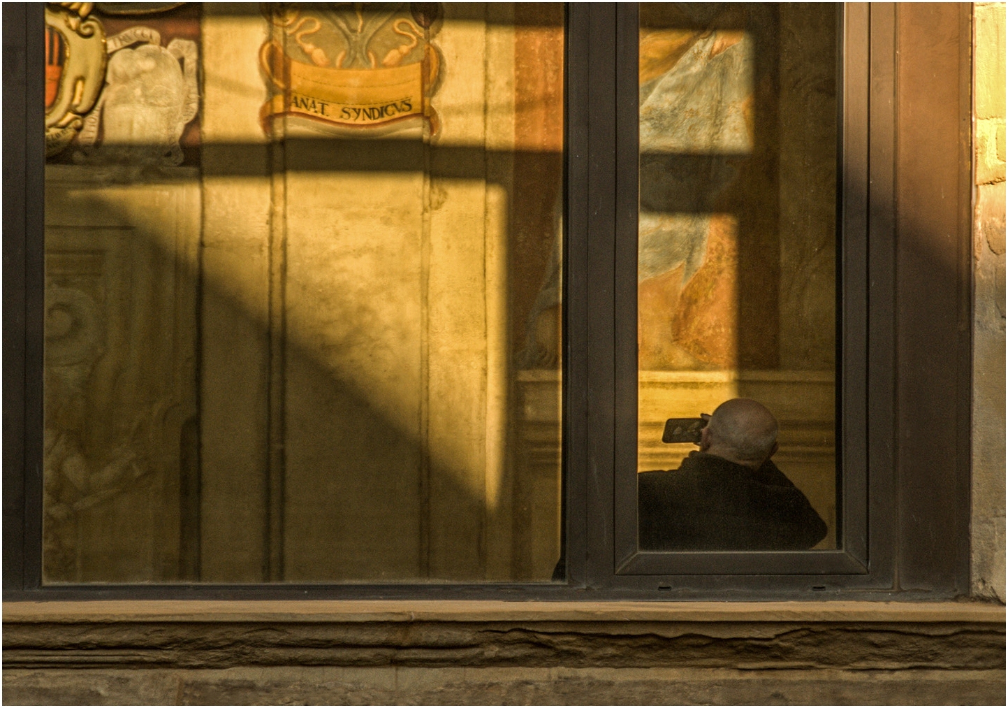 Uno scatto rubato, ma in modo raffinato: la posizione e l'azione del soggetto, il gioco di luci e ombre, la geometria... tutto quadra.
