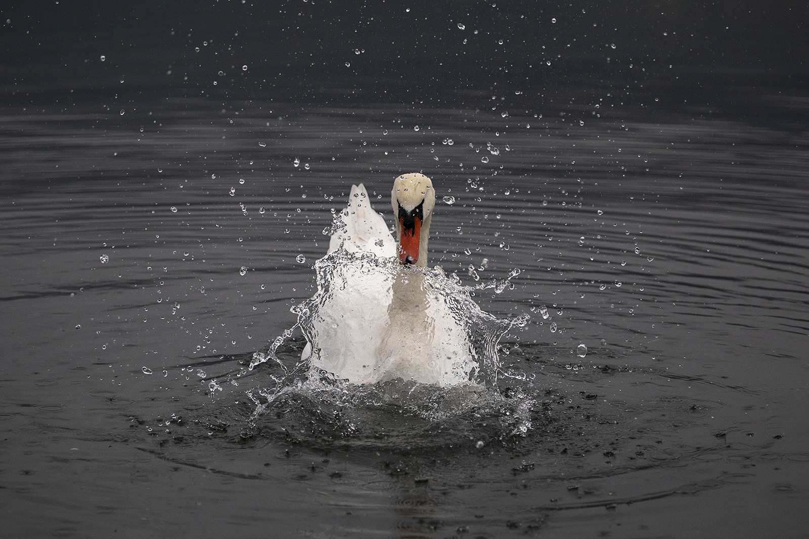 Molto belli questi schizzi d'acqua , il cigno che ne emerge e lo sfondo che lo risalta.