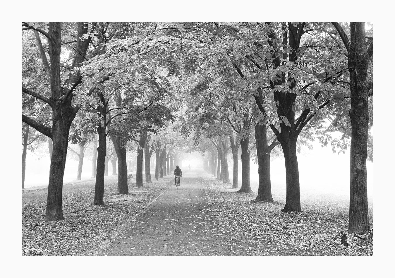 Egregia la conversione con cui hai saputo ben valorizzare lo scenario, la nebbia bianchissima, quasi bruciata, da una intrigante sensazione di etereo all'immagine, l'uomo sembra quasi pedalare sospeso tra sogno e realtà.