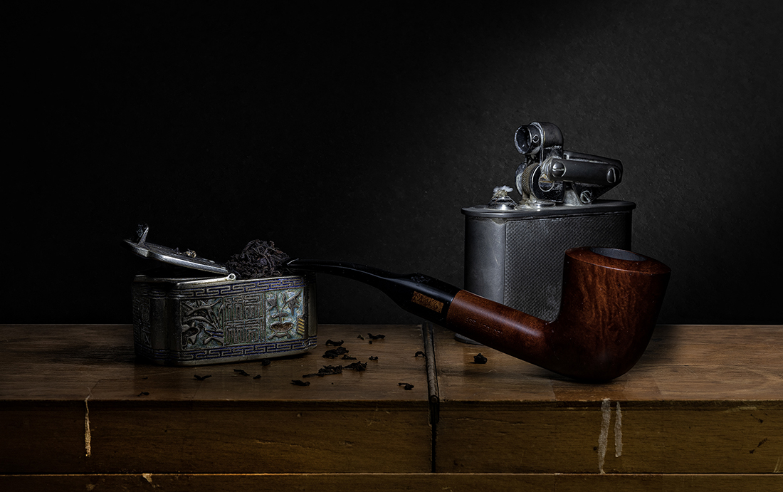 Tre scatti sovrapposti (piano di appoggio, pipa con accendino, scatolina metallica). fondo inserito in post prod