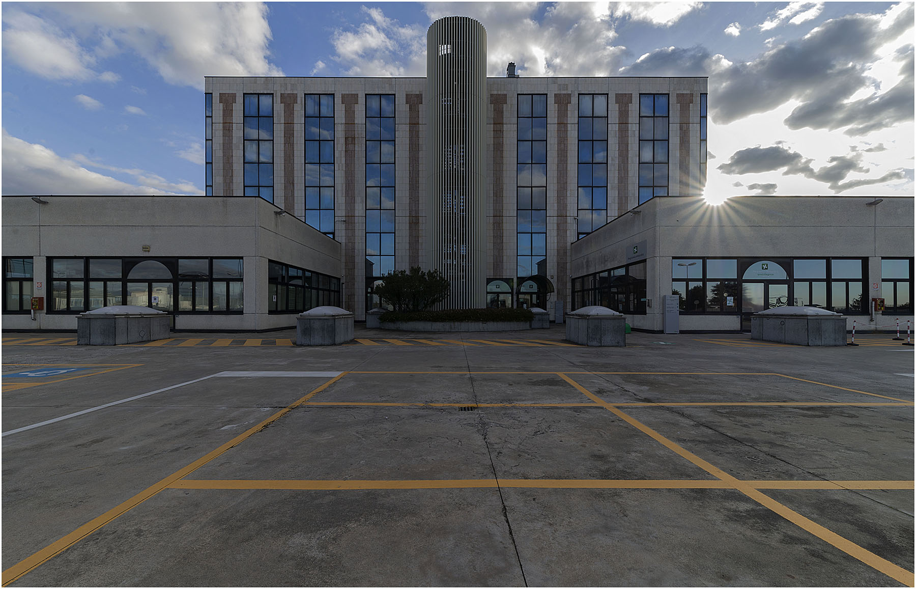 sarò sincero, il soggetto non mi piace ma apprezzo la rigidità compositiva, edificio perfettamente simmetrico e linee del parcheggio che chiudono gli angoli inferiori.