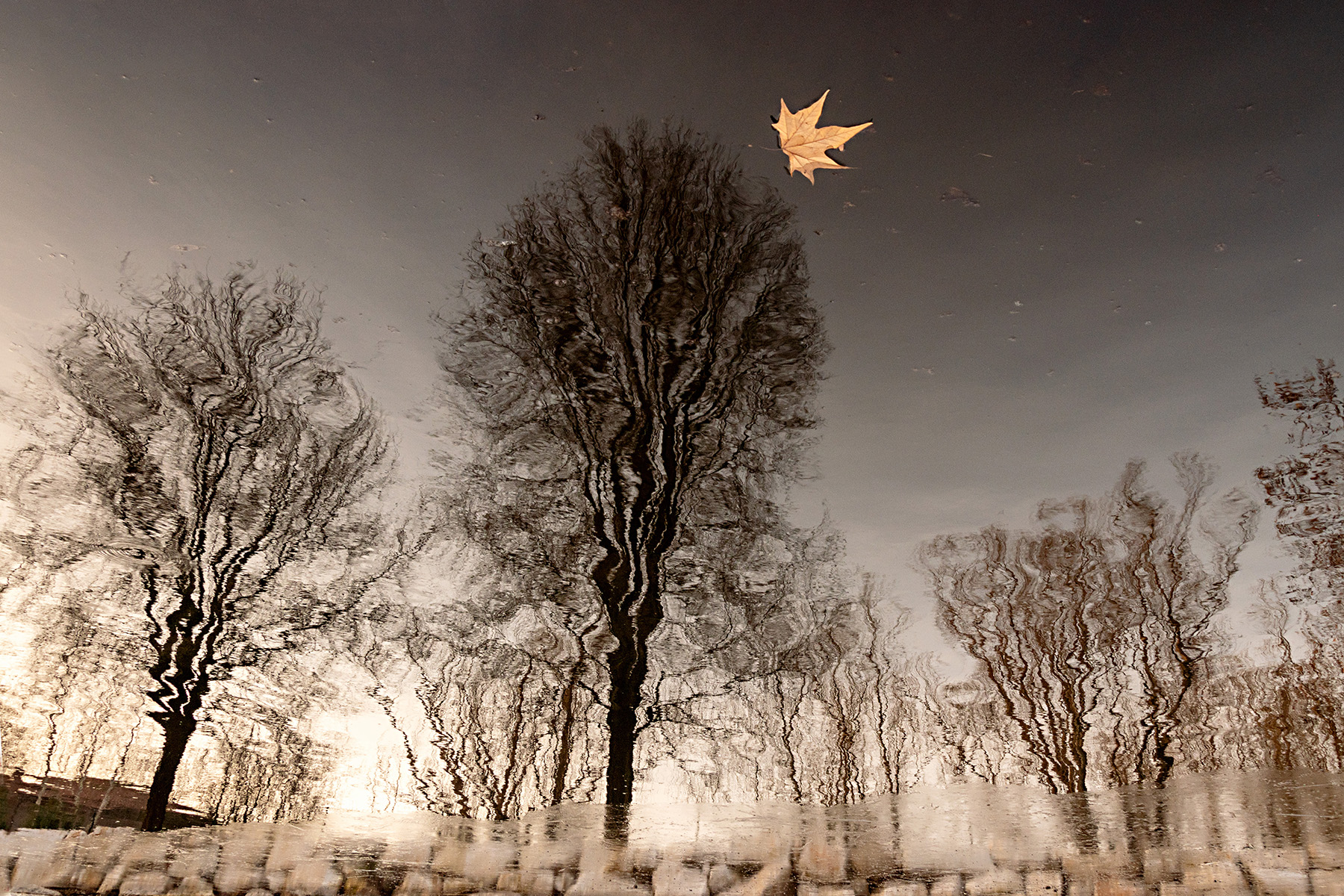 delicata e sognate, la foglia reale che si stacca dall'albero riflesso