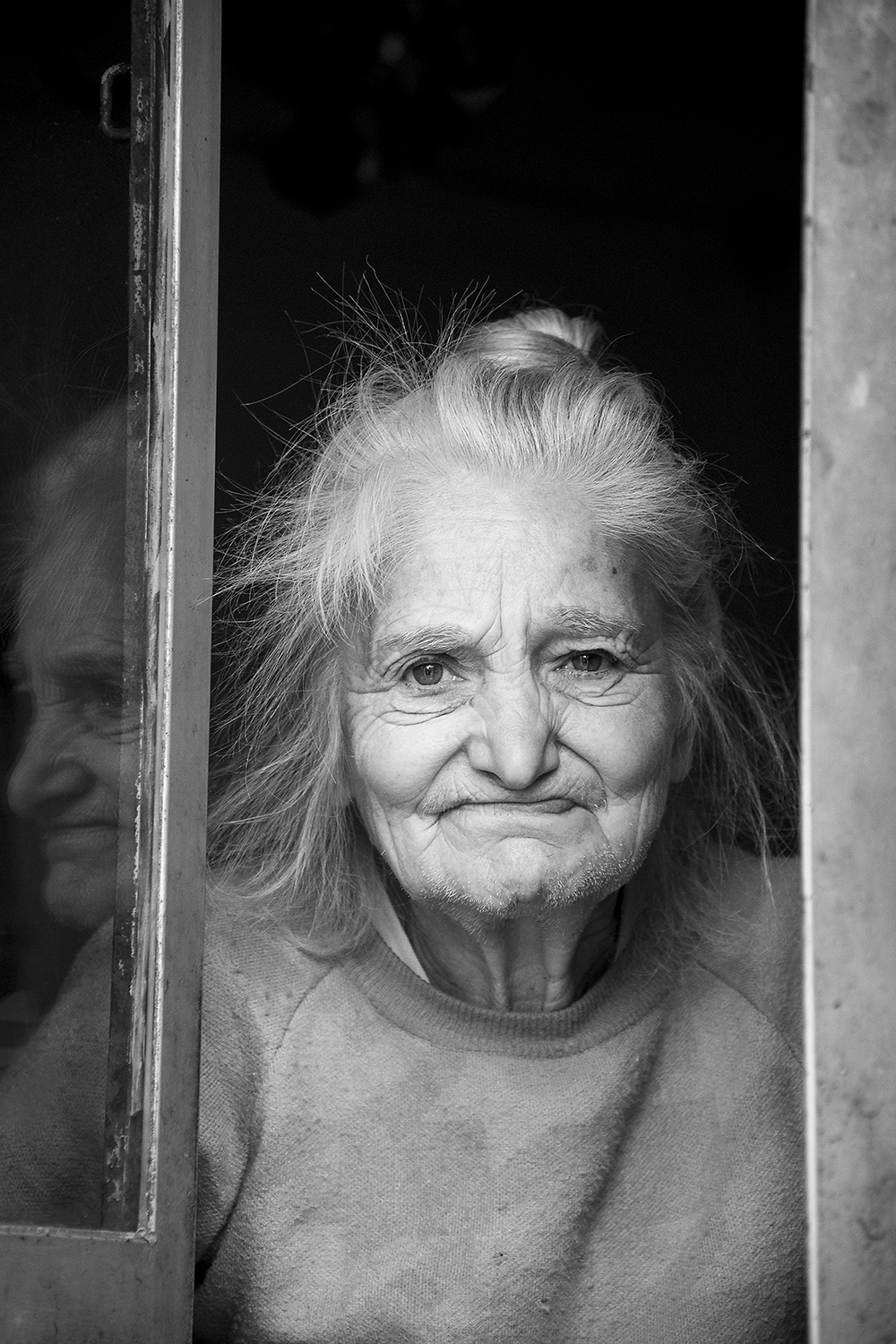 Ma questa dolce signora è la stessa protagonista di qualche altro tuo scatto? O forse sto confondendo... Mi piace moltissimo questo tuo lavoro. La sua timidezza, il suo essere un poco impacciata, diventa il punto di forza di questo ritratto, lo rende genuino e vero, è un discorso diretto ma fatto con discrezione e rispetto e questo si legge in quell' accenno di sorriso che ti dà il benvenuto nel suo umile mondo. Ottima anche la costruzione dello scatto, con il viso ben incorniciato e il valore aggiunto del riflesso. Ciao