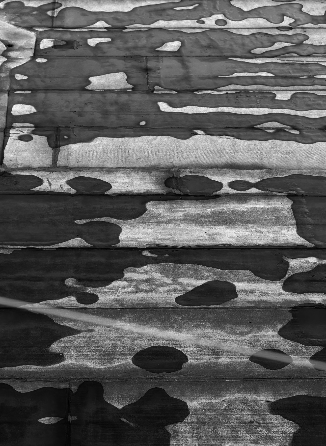 Credo che si tratti di un ondulato metallico con le tipiche chiazze. Il bianco e nero rende l'immagine più astratta e quindi interessante. Sempre attentoil tuo occhio.