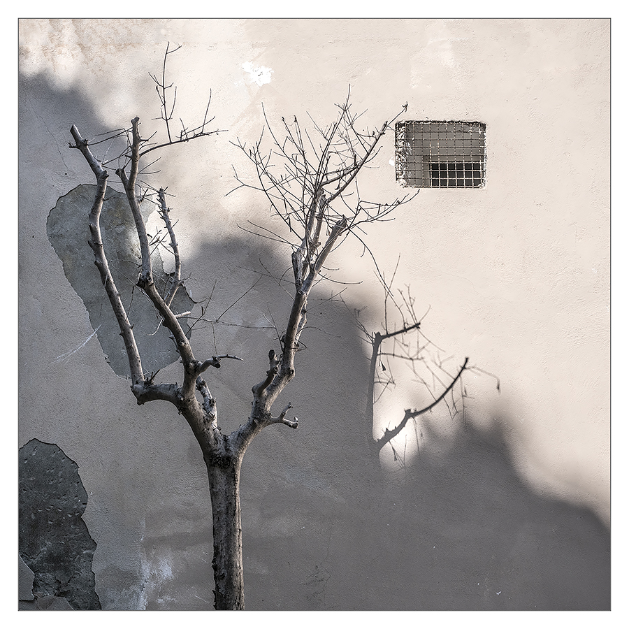 La pianta spoglia sembra sostenere con i sottili rami la piccola apertura schermata dalla grata. Intristisce questa questa visione priva di vita e di chiusura , anche il muro scrostato ed il forte contrasto fra luce ed ombra contribuisce a rafforzare questa percezione.