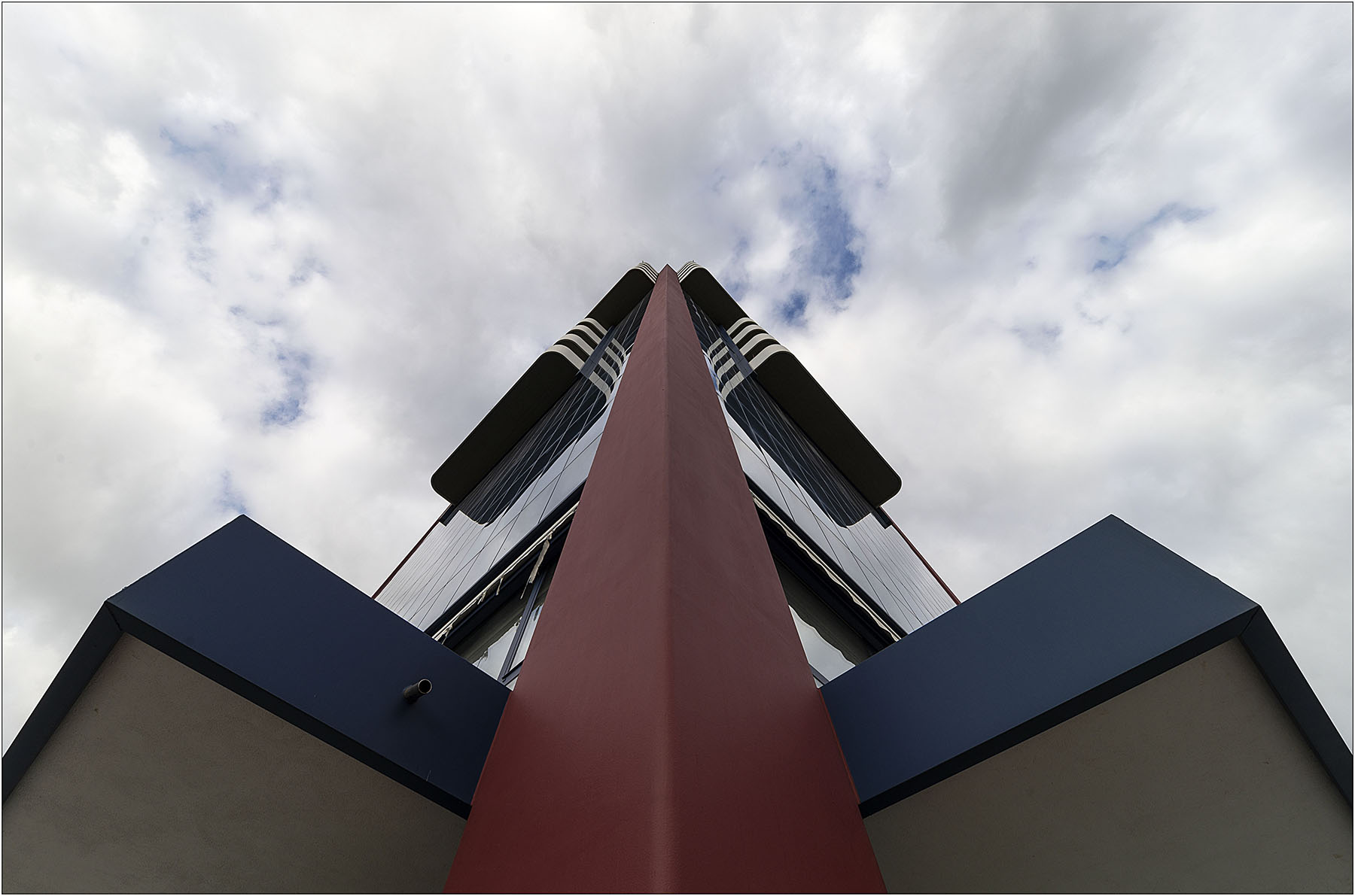 Le accentuate linee cadenti enfatizzano la sensazione di verticalità, belli i colori ed il cielo, avrei clonato lo scarico dell'acqua, disturba la pregevole simmetria compositiva.