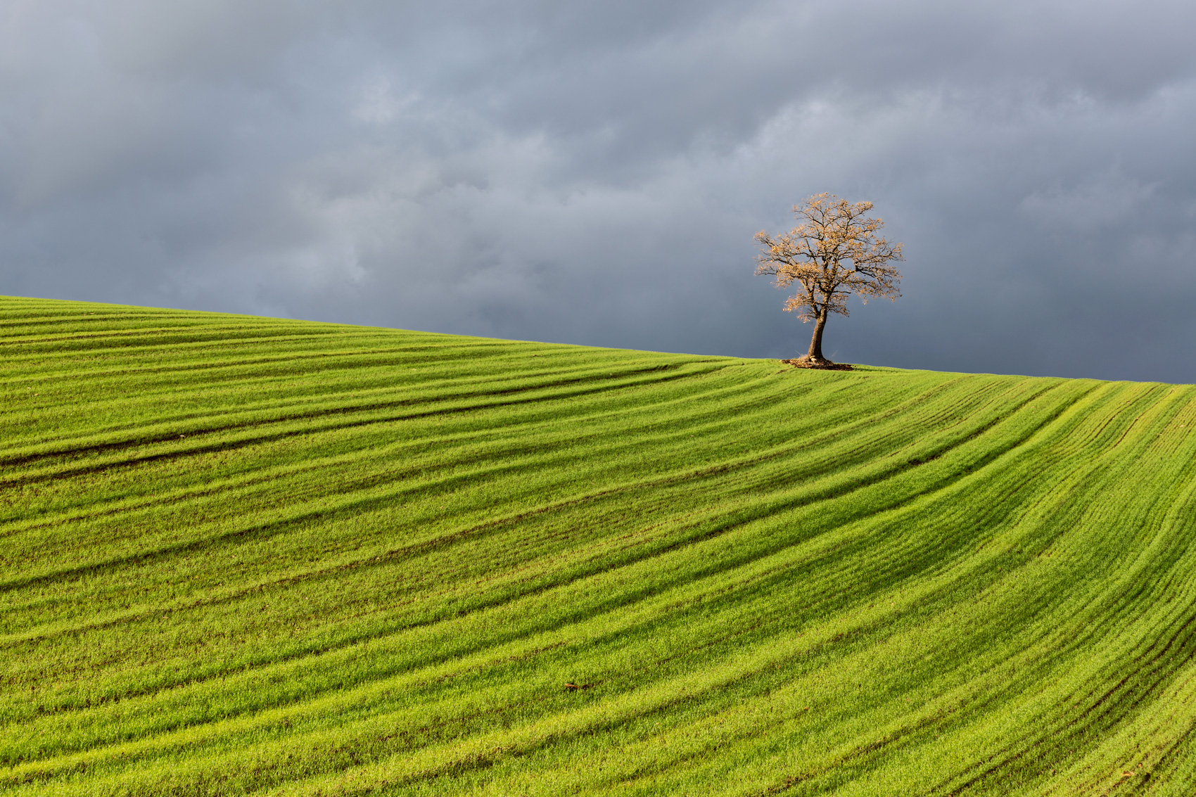 Albero solitario che domina la collina. Minimale ed arricchita dalle linee diagonali del prato e dalla bella luce. Ottima foto per me