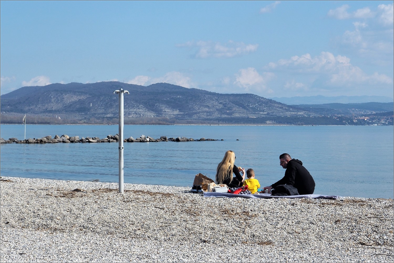 La piccola famiglia.. Madre figlio e padre in riva al mare con il primo sole.. per fare un buon picnic.. ottima immagine e composizione. Per me un buon scatto.