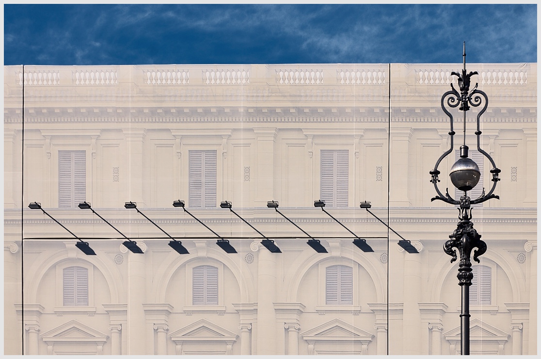 Perfetta la composizione, di grande effetto il lampione che si staglia sulla finta facciata, un vero piacere per gli occhi la sfilza, o parata come dici tu, di ombre dei fari che la illuminano, grazioso pure il cielo