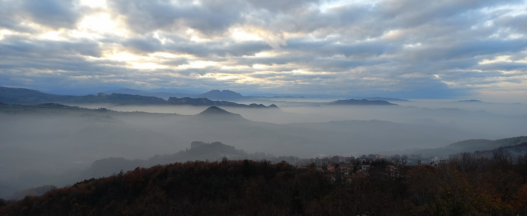 Il panorama è senza ombra di dubbio suggestivo e pieno di fascino, la nebbia, il cielo, le cime che fanno capolino, eppure mi sembra che manchi qualcosa.