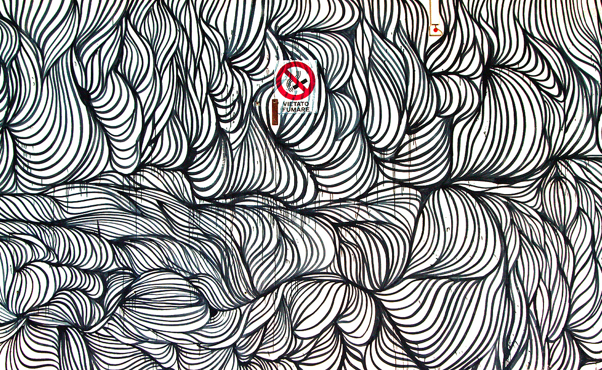 La ripetizione dei motivi curvilinee ben contrasta con la forma squadrata e il rosso del cartello del divieto ma ben si coniuga con la sigaretta e le curve in bianconero all'interno dello stesso.