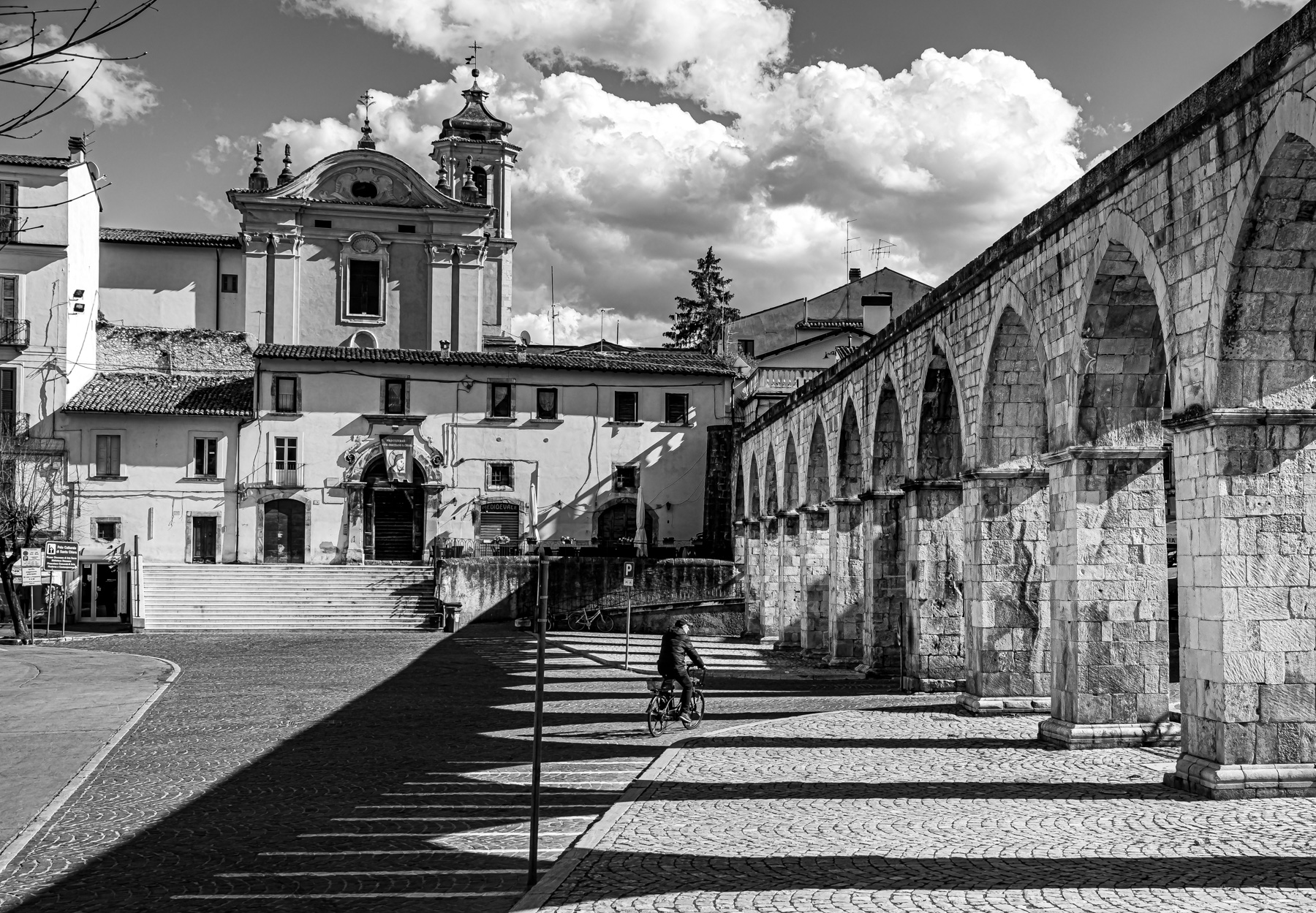 Fantastica la continuità tra la linea dell’acquedotto e la sua ombra (persino le chiusure!), bellissime le ombre nette degli archi, perfetto il posizionamento del ciclista (come hai fatto a trovare un momento senza altre persone o auto?), un bianco e nero dettagliato e luminoso… insomma un’immagine eccellente, bravissimo!